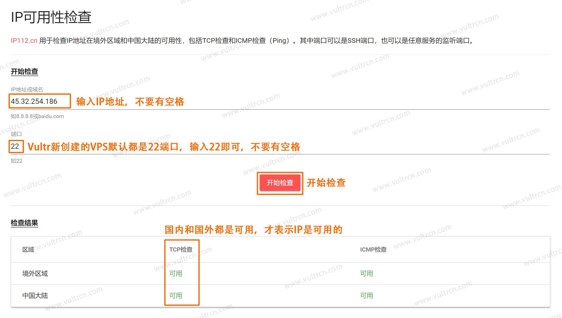 为了确保服务器的可用性,我们可以检测服务器的IP。访问IP112.cn,依照要求输入服务器的IP地址和端口(默认填写22),点击检查。